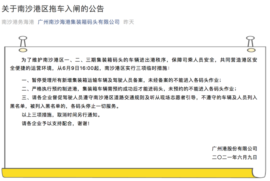 南沙港也于6月9日宣布,为了维护南沙港区一、二、三期集装箱码头的车辆进出港秩序,从当日16:00起,该港区实行如下三项临时措施。