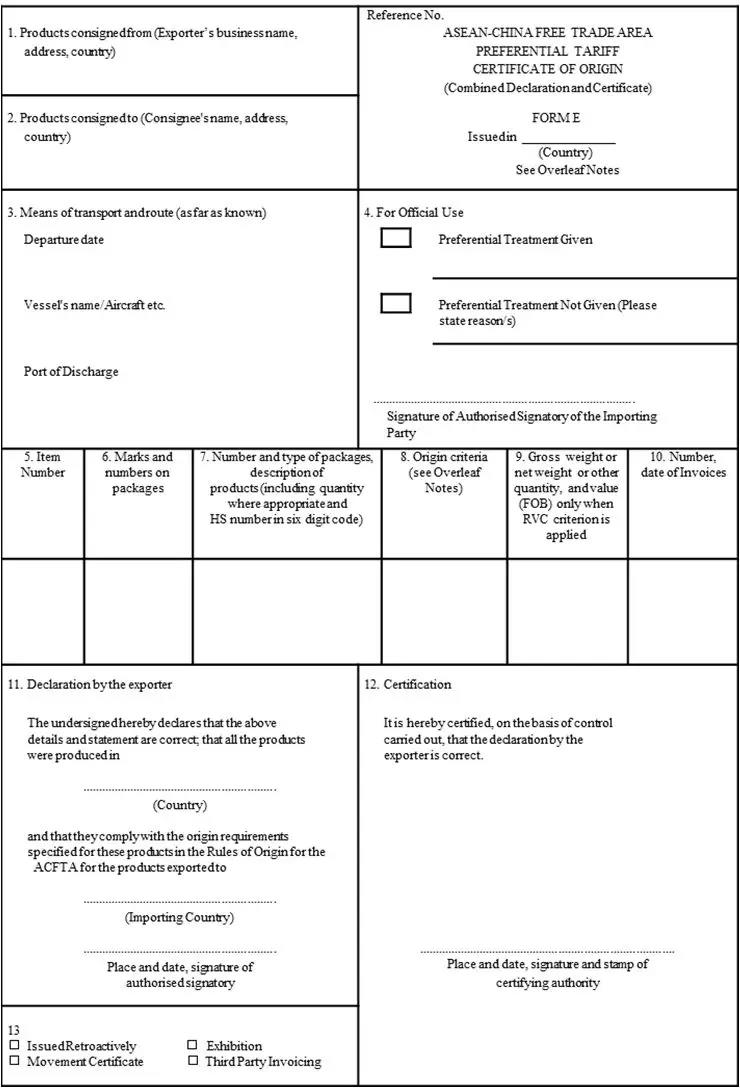 中国一东盟自由贸易区优惠原产地证明书(以下简称 FORM E证书)共有13栏,各栏填制要求如下:
